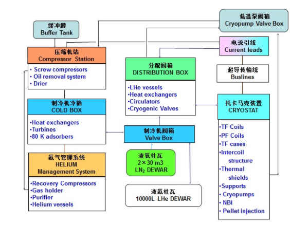 低温系统用来将EAST超导纵场磁体和极向场磁体从室温降温到4.5 K(-269℃),并维持五至六个月的实验。此外,低温系统还要保障26根15kA电流引线、26根超导传输线、25吨内外热辐射屏、2套内置低温泵、2套NBI装置及1套弹丸注入装置的冷却。