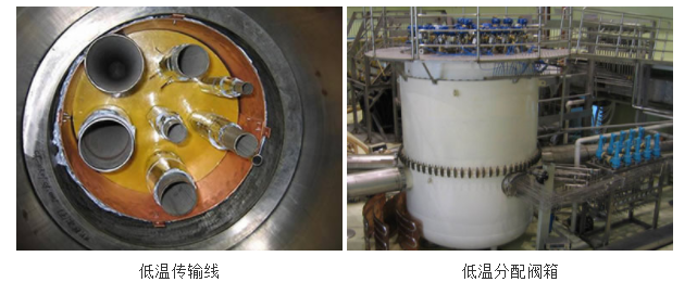 低温分配系统用来将制冷机的冷量分配给各超导磁体、超导传输线、电流引线和80K热辐射屏等冷质部件。分配阀箱介于氦制冷机与托卡马克装置之间,通过高真空多层绝热低温传输线输送低温流体。分配阀箱内安装有4台超临界氦循环泵,分别用于纵场线圈和纵场线圈盒的迫流冷却。