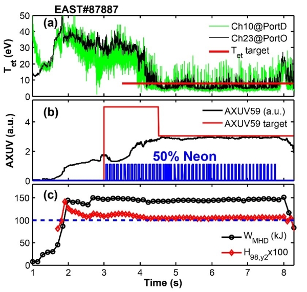 在EAST装置上发展的这一新辐射偏滤器反馈控制方案,实现了在Grassy ELM高约束等离子体条件下,稳定辐射偏滤器部分脱靶与良好等离子体芯部约束性能的兼容运行,有效控制了瞬态和稳态偏滤器靶板热负荷,为EAST高参数长脉冲稳态运行放电提供了一个非常具有应用前景的等离子体控制方案,并为未来的稳态聚变反应堆控制提供了有益参考。