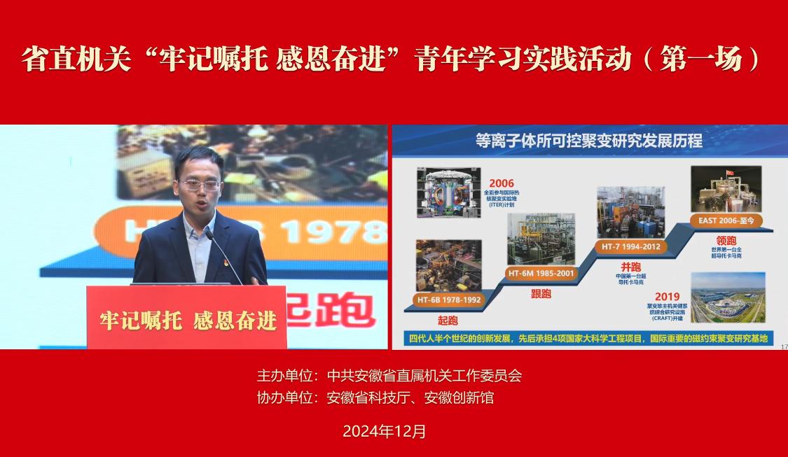 12月20日上午,安徽省直机关“牢记嘱托感恩奋进”青年学习实践首场活动在安徽创新馆举办。活动以“人生能有几回搏的劲头助推科技自立自强”为主题,聚焦全面建设量子信息、聚变能源、深空探测三大科创引领高地。等离子体所团委应邀组织超导托卡马克团队先进事迹参加主题宣讲活动。省直机关工委副书记陈欢,团省委副书记、省青联主席李波,省科技厅二级巡视员王孟忠出席活动。