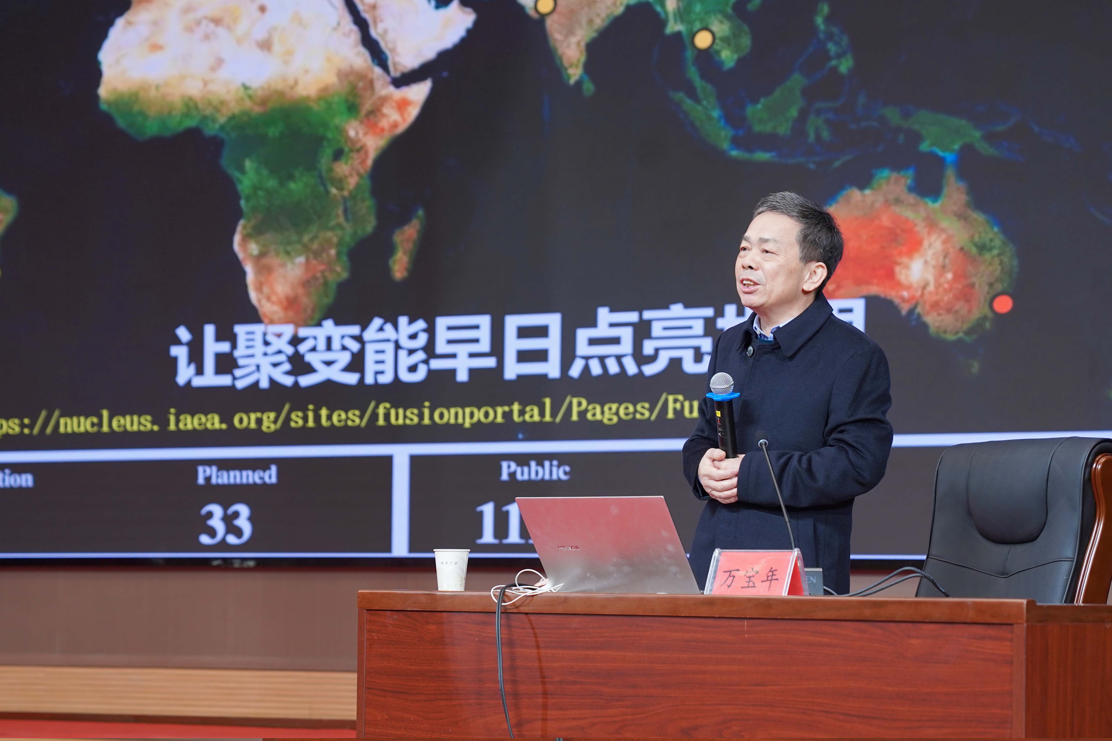 活动中,中国科学院合肥物质科学研究院研究员、等离子体所首席科学家万宝年院士,为在场师生带来了一场题为“让聚变能点亮未来”的精彩科普报告。万院士以其深厚的学术功底和前瞻性的视野,深入剖析了可控核聚变作为未来理想终极能源的重要性和战略意义,对聚变能在实现可持续能源供给中的关键作用进行了深入分析。他回顾了磁约束核聚变的发展历程,详细介绍了其基本原理、技术路线和发展现状,并对聚变能在实现可持续能源供给中的关键作用进行了深入分析。同时,他还探讨了面向下一代聚变燃烧的工程物理挑战及当前聚变研发中所面临的核心热点问题,对存在的挑战和机遇进行了全面分析和展望,并分享了对未来聚变能技术发展和应用的深刻见解。