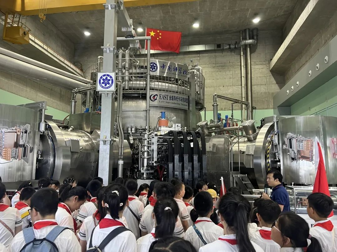 活动现场,庐阳区海棠街道“庐小志”代表、校外辅导员代表、长江路第三小学海棠花园校区四(6)中队科创小队,亳州路小学四(4)中队的少先队员们,实地参观全超导托卡马克EAST装置和聚变堆主机关键系统综合研究设施。孩子们近距离观察“人造太阳”装置,现场聆听讲解。“什么是核聚变?”“为什么要研发核聚变能源?”“核聚变的前景如何”……科普讲解员们用深入浅出、通俗易懂的语言徐徐描绘,孩子们认认真真做着笔记,踊跃提问,现场洋溢着浓厚的科学气氛。在“国之重器”面前,孩子们既震撼又兴奋,他们真实感受着合肥的“科里科气”,为国家科技进步而骄傲自豪。