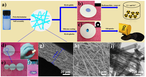 近年来,频繁的海上石油泄漏和核事故对人类所处的生态环境造成了严重的污染,污染物在短时间内难以消除。该课题组人员通过层层自组装技术,以钛酸盐纳米带和聚乙烯亚胺(PEI)为原材料,构建了可塑性的纳米多孔薄膜材料,发现该钛酸盐纳米带薄膜材料对核素Sr和Cs有优异的富集与吸附性能,并能在很短的时间内实现快速去除。研究结果表明,对Sr2+和Cs+的去除机制主要依赖于钛酸盐纳米带的的离子交换反应,其(003)晶面的层间收缩有力证明了这一观点。与此同时,再在薄膜表面覆盖一层挥发性有机硅后,得到疏水性薄膜(水的接触角>150.58o),对水体中的油性物质具有出色的选择性和快速吸附能力,其吸附容量高达自身质量的23倍。该研究工作为以后的废水处理和分离技术提供了新思路。