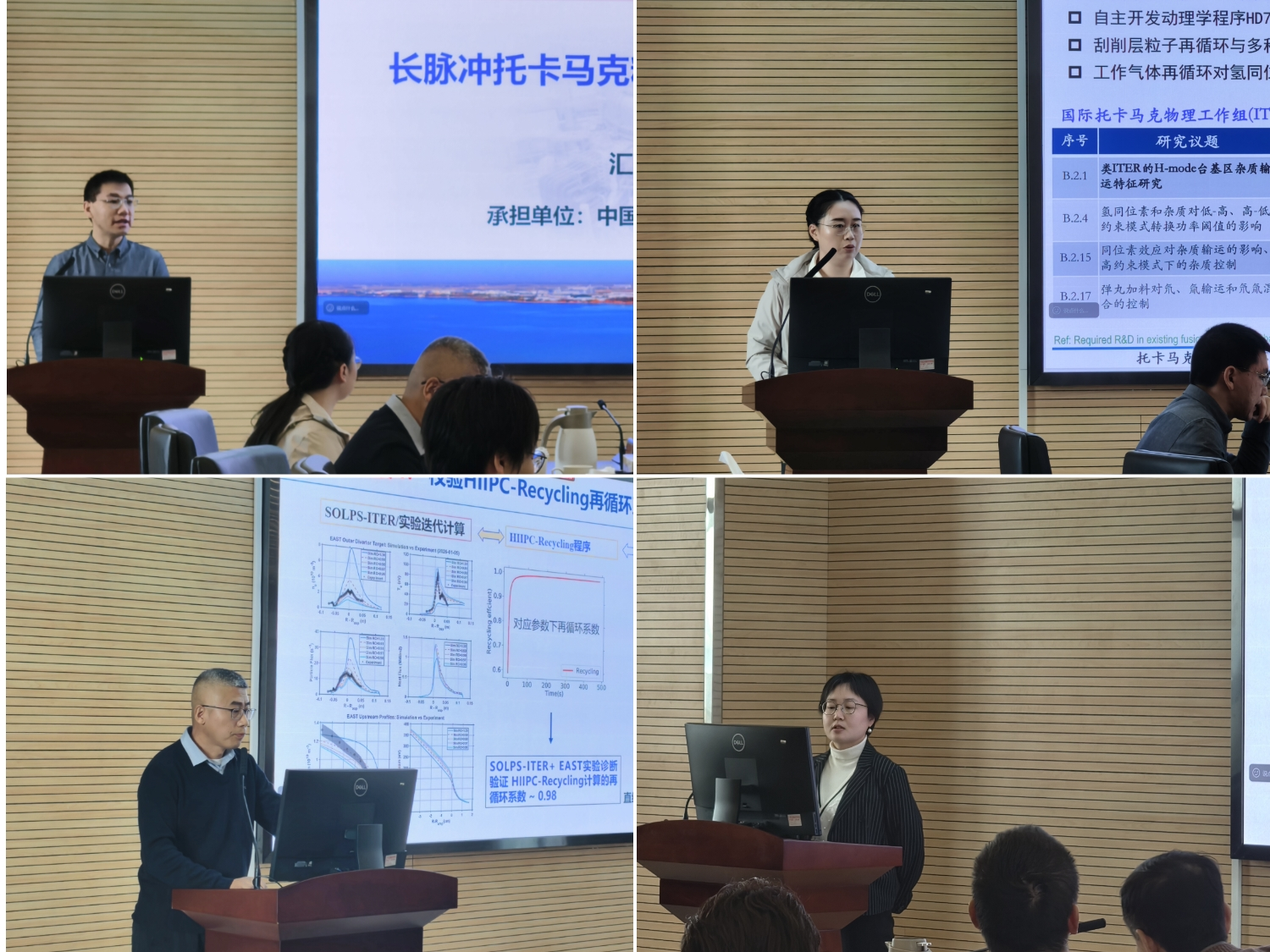 会上,各项目负责人分别作“长脉冲托卡马克粒子再循环演化机理研究”、“托卡马克粒子再循环对边界湍流和约束模式转换的影响”、“粒子再循环物理过程及其对偏滤器脱靶影响的模拟与实验研究”、“EAST长脉冲条件下杂质粒子再循环及其对等离子体约束性能的影响”专题汇报,并系统总结了2025年度项目任务指标完成情况及下一阶段重点研究计划。与会专家认真听取报告后,对各项目取得的阶段性进展给予充分肯定,并围绕长脉冲条件下粒子再循环的物理机制分析、数值模型构建、技术路线优化等关键科学问题,提出了多项具有针对性和建设性的指导意见。