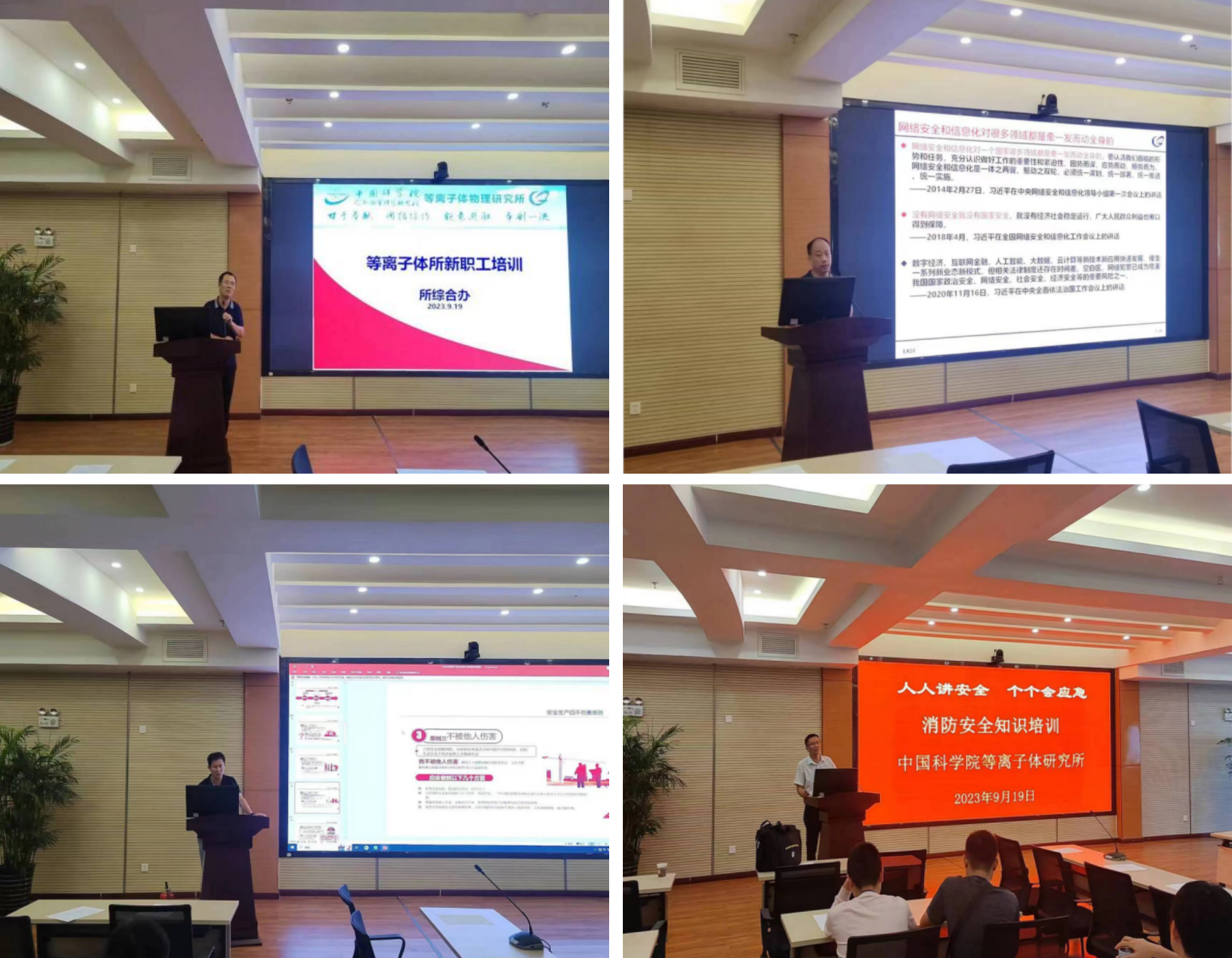 为使新职工及研究生深刻认识到安全工作的重要性,进一步提升大家的安全保密意识,此次培训还进行安全管理主题培训活动,综合办副主任李家星、计算机应用研究室室务委员王枫、所安全主管盛中平及安徽政安防火技术有限公司张教官联合为新职工和研究生进行了EAST信息系统介绍、网络安全、所安全、消防安全等培训活动,并组织大家进行消防灭火实际操练。