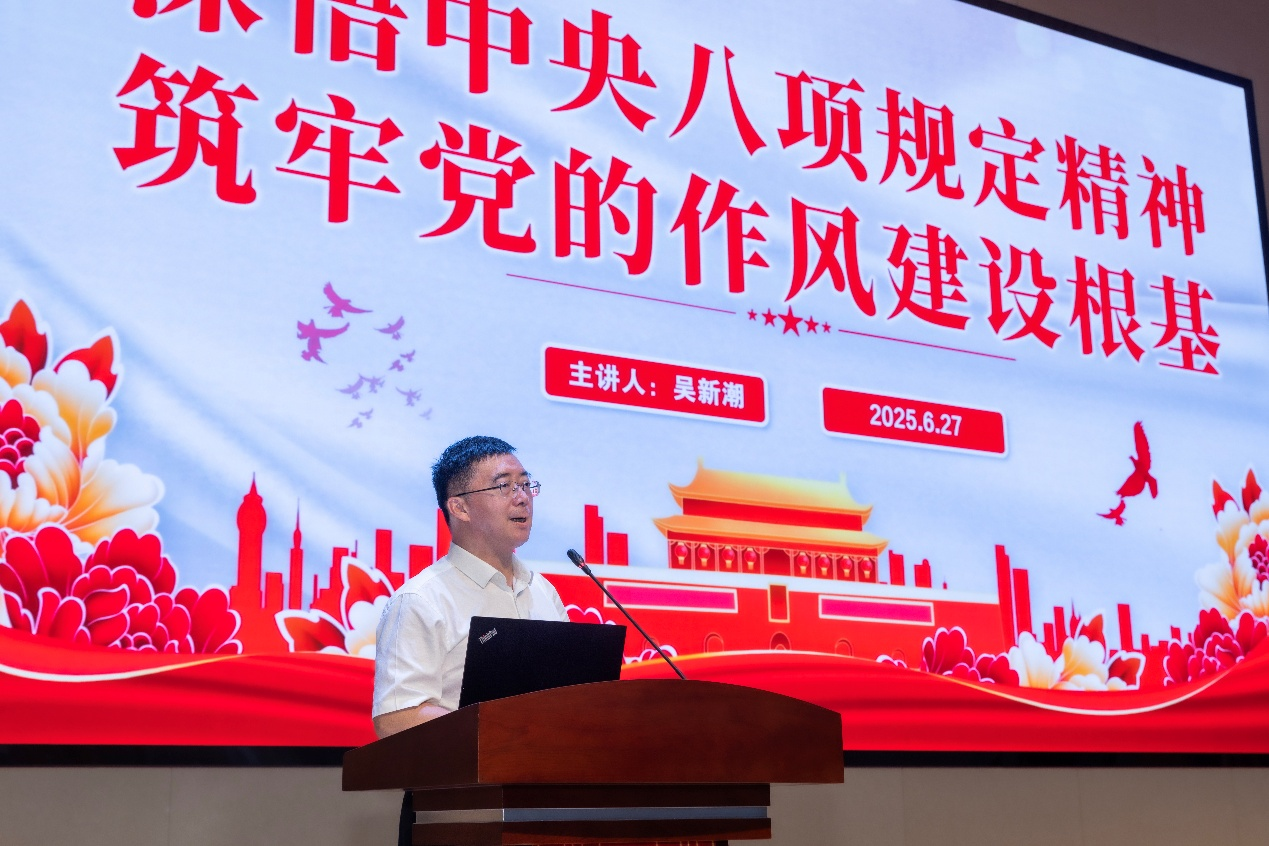 吴新潮在党课中系统阐述了中央八项规定精神的历史脉络与时代价值。他指出,深入贯彻中央八项规定精神学习教育,是党和国家领导人亲自点题部署的重要党建任务,彰显了以习近平同志为核心的党中央推进全面从严治党的坚定决心。他系统梳理了党的十八大以来开展的八次集中教育,从延安整风“窑洞对”到新时代“自我革命”,深刻阐释中央八项规定作为新时代“徙木立信之举”的政治意义——既是党自我净化、自我完善、自我革新、自我提高的重要途径,也是密切党群干群关系的必然要求,更是推进中国式现代化的有力保障。