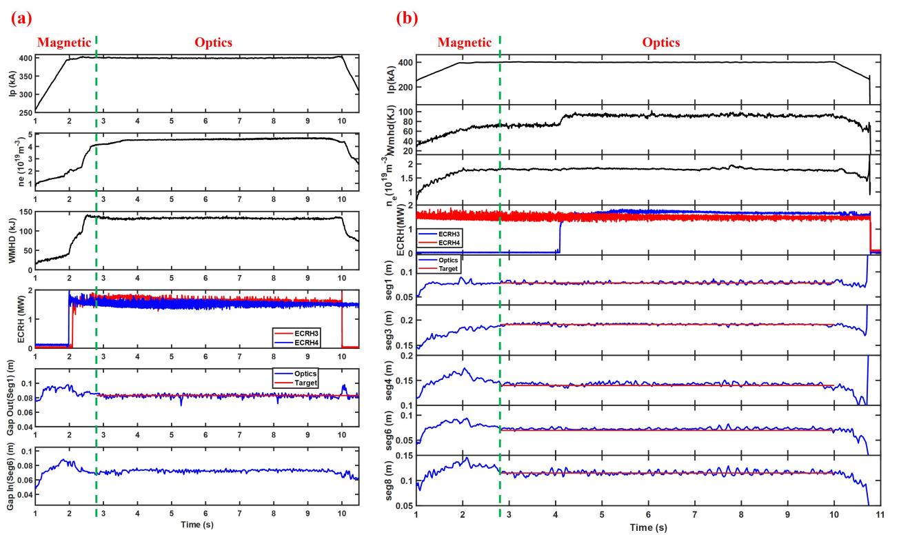 从2.8秒开始由LCFS计算的控制点位置切换至光学重建等离子体边界计算的5个光学控制点(低场侧seg1、seg3和高场侧seg4、seg6、seg8),稳定完成了等离子体位形控制。这是EAST装置上、甚至是托卡马克装置上,首次实现基于光学边界的多控制点等离子体位形控制,标志着光学位形控制从概念验证走向实际应用。