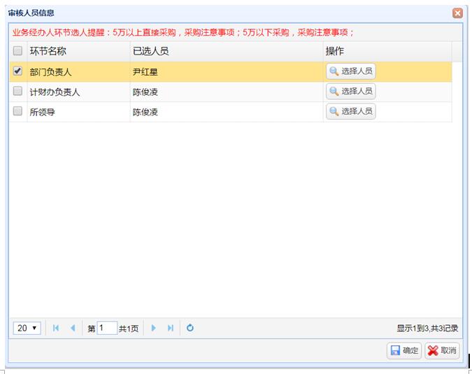 点击选择人员,打开人员选择框,系统将根据角色列出所有备选人,用户可在备选人列表中选择后点击确定,进行保存。