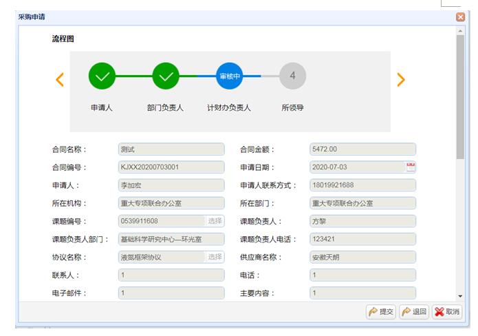在页面下方填写办理意见后,可点击“提交”,将该条待办提交至下一环节审批,如果内容中有问题,可点击“退回”,将该条待办退回至申请人环节,重新修改内容。