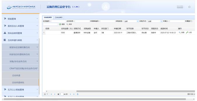 点击页面左边应用-合同申请审批,或点击右上待办事项,进入合同申请审批页面。