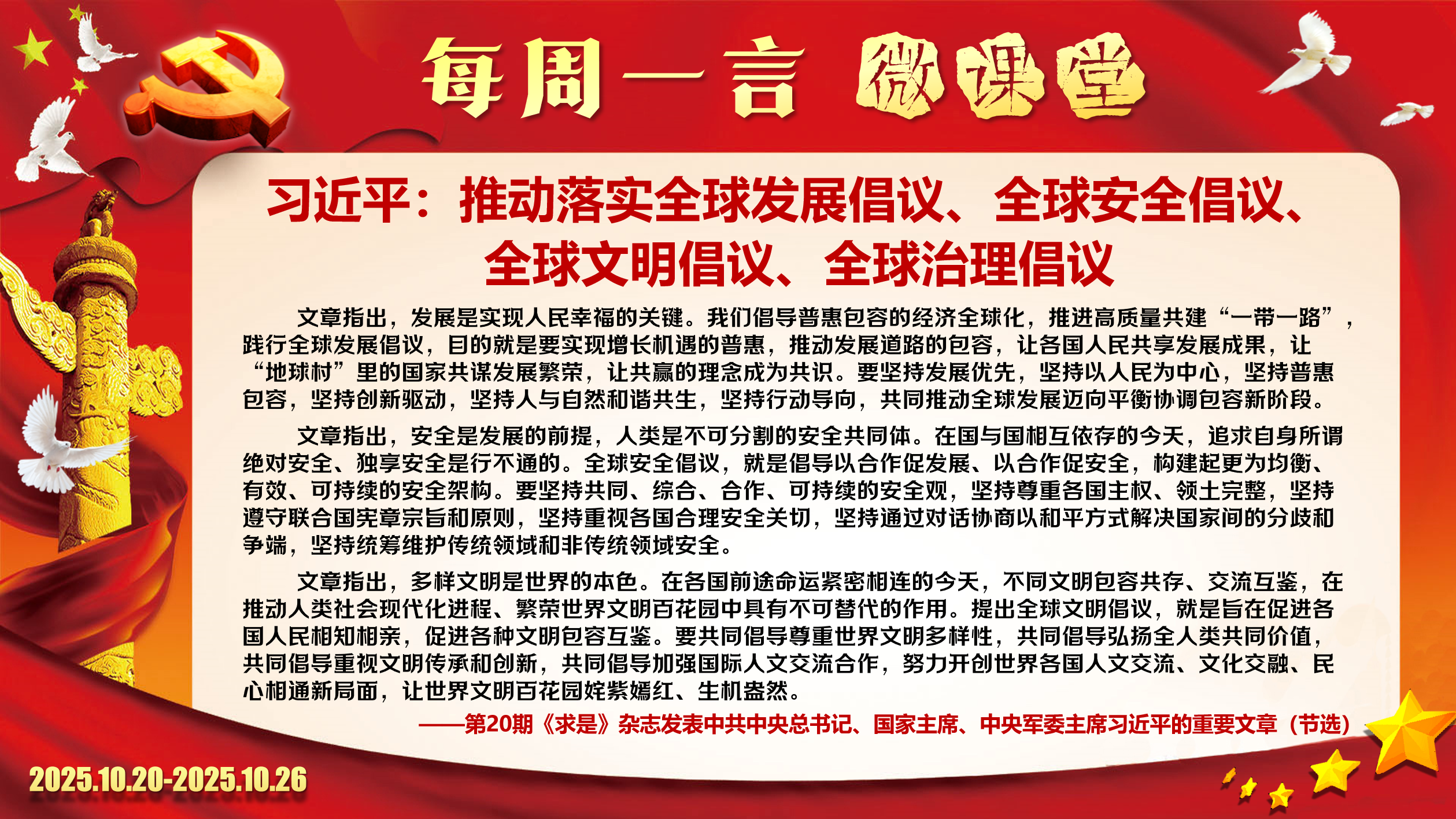 【20251020每周一言】习近平:推动落实全球发展倡议、全球安全倡议、全球文明倡议、全球治理倡议