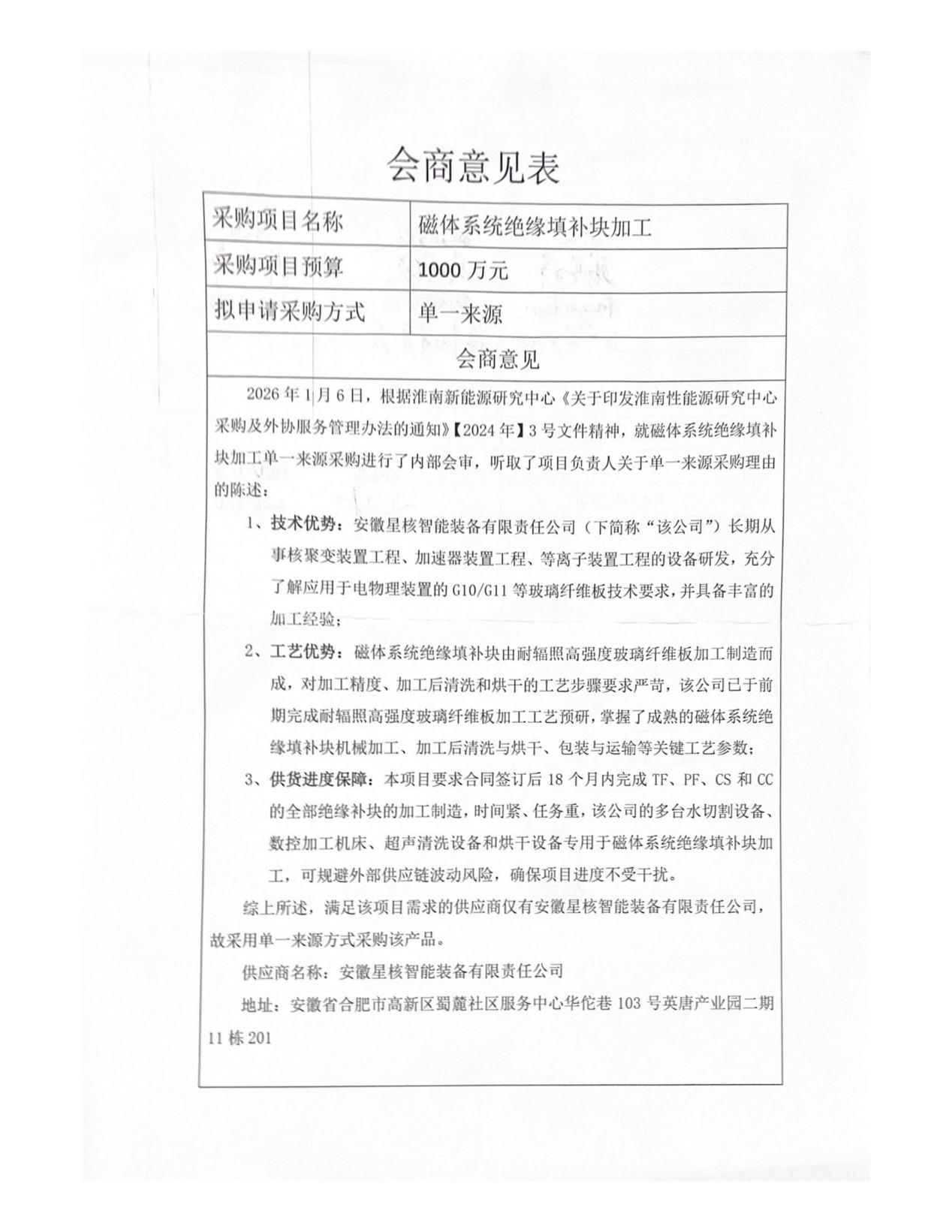 根据淮南新能源研究中心《关于印发淮南新能源研究中心采购及外协业务管理办法的通知》精神,中心就磁体系统绝缘填补块委托加工进行了单一来源采购内部会商,现将会商意见公示如下: