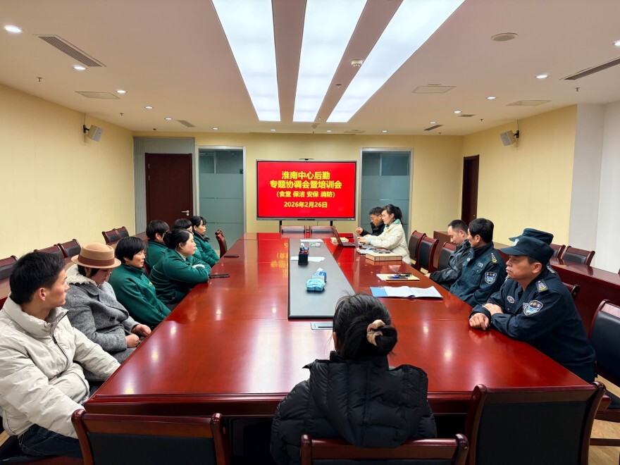 2月26日,淮南中心综合处组织召开2026年度首次后勤专题协调会暨培训会,全面部署食堂、保洁、安保、消防等后勤保障工作,并开展专项安全培训。综合处相关人员、第三方服务单位负责人及一线后勤员工等20余人参会。