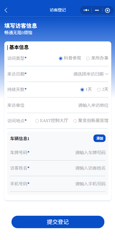 7. 访问类型选择“科普参观”后按照要求填写信息并提交。
