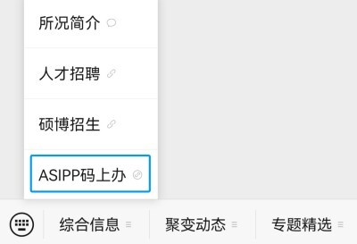 2.点击公众号底部左下角“综合信息”,弹出后点击“ASIPP码上办”。
