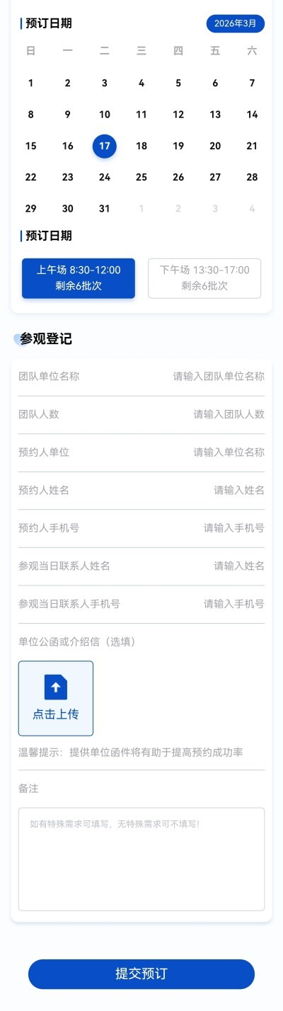 6. 参观每日限额上下午各6批,审核通过后将以短信形式通知,请注意查收。