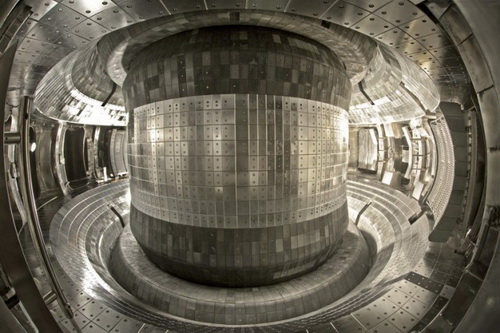The interior of the donut-shaped Experimental Advanced Superconducting Tokamak (EAST). Hydrogen plasma is confined in this chamber by strong magnetic fields, where it fuses into heavier nuclei.