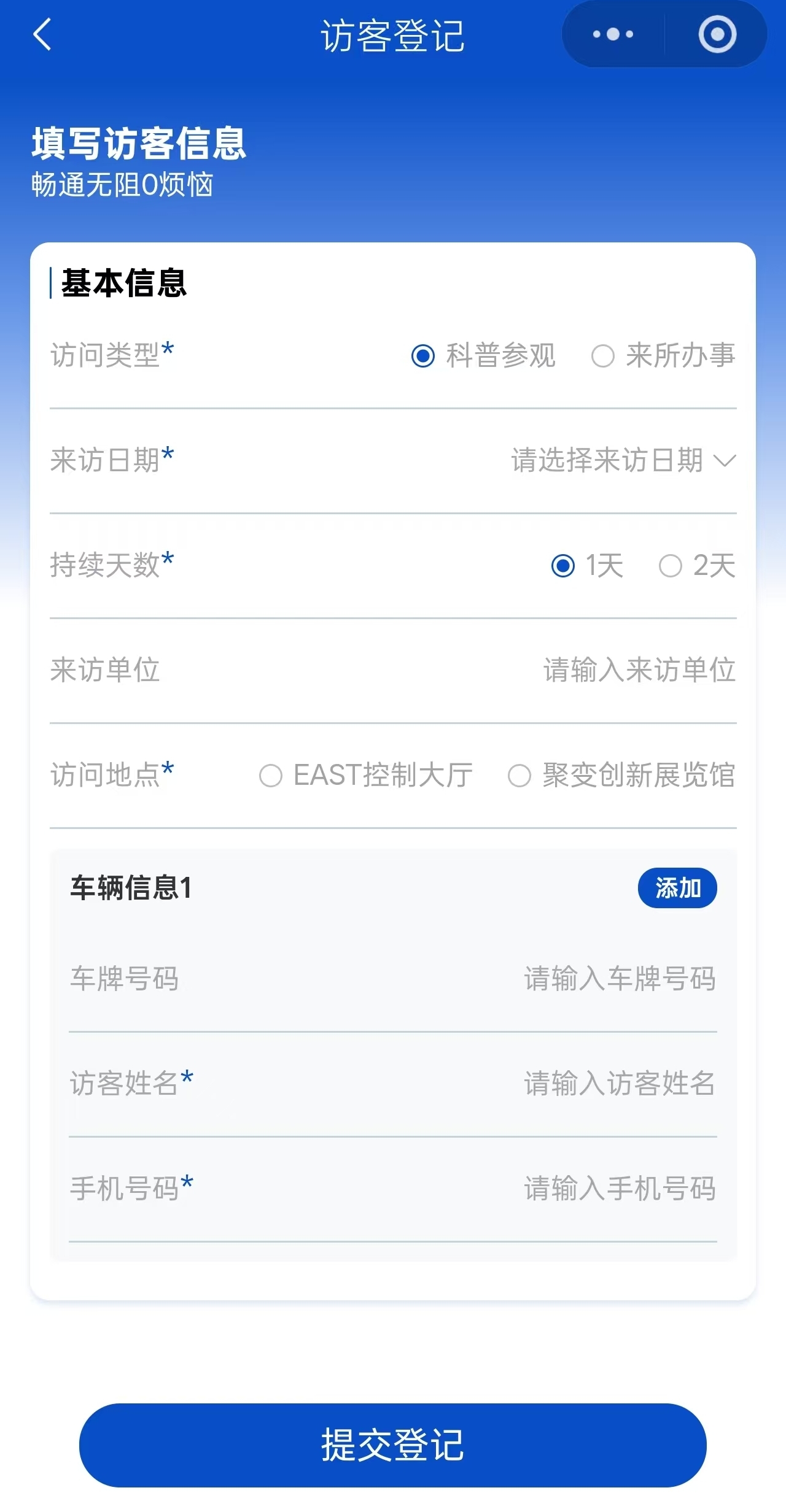 参观预约通过后,请您务必及时进行【访客登记】。选择【访客登记】-【科普参观】,按要求填写信息并提交。您的申请将交给相关人员审核,审核通过后将以短信形式通知您,请您留意消息通知。