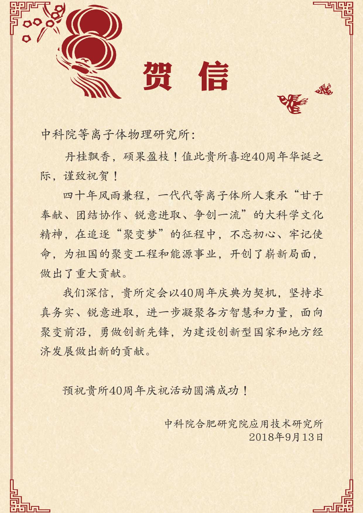 中科院合肥研究院应用技术研究所贺信