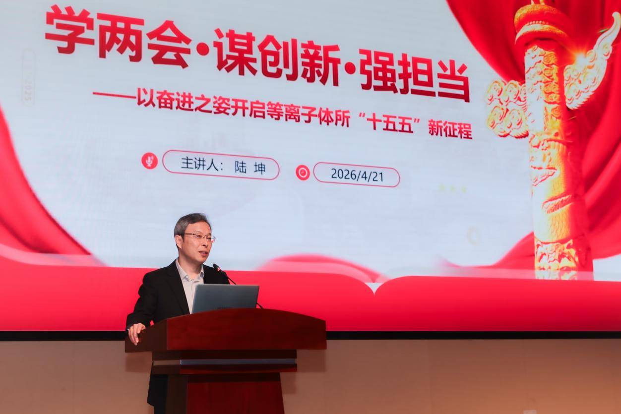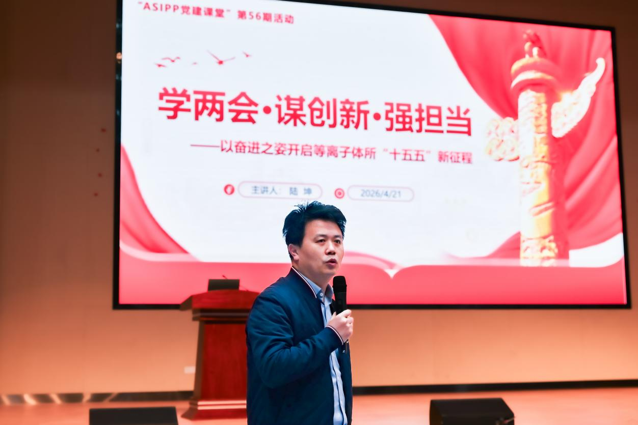 为深入学习贯彻2026年全国两会精神,领会“十五五”规划纲要重点内容,引导广大党员强化使命担当、凝聚奋进力量,4月21日下午,等离子体所举办第五十六期“ASIPP党建课堂”活动。常务副所长、党委委员陆坤以《学两会 谋创新 强担当——以奋进之姿开启等离子体所“十五五”新征程》为题作专题党课,所党委副书记、副所长钱金平主持活动。全所党员、中层领导干部现场参加学习。