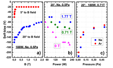 自偏压随磁场及不同清洗参数的变化:(a)不同磁场强度;(b)射频功率;(c)工作气体和工作气压