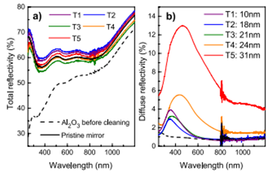 图2 磁场角度为20°时清洗前后第一镜全反射率(a)和漫反射率(b)的变化