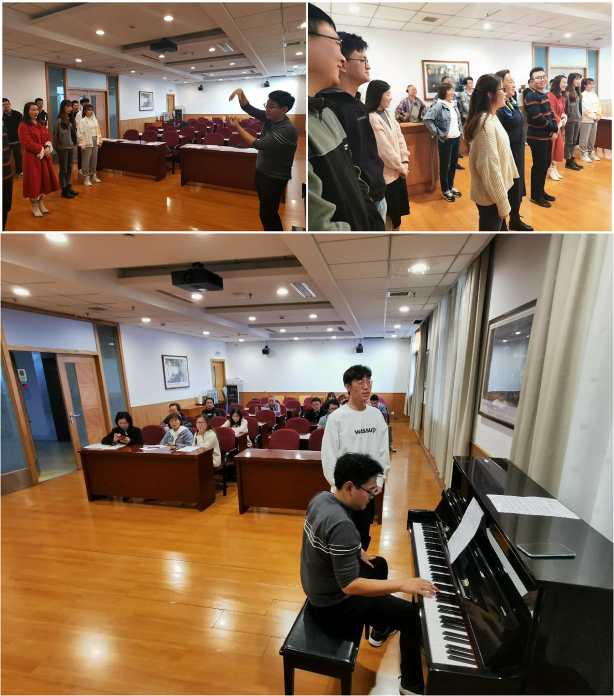 11月18日下午,青年合唱队在四号楼六楼中间会议室正式开课,所内年轻的歌唱爱好者齐聚一堂,进行了第一次排练。钱泽华首先带领青年师生们进行发声练习并传授发声技巧。随后,大家一起学唱歌曲《我相信》,因歌曲主旋律耳熟能详,很快便进入歌唱状态,伴随着动听的钢琴声,大家认真投入地演唱,体验着歌声带来的愉悦感。为进一步掌握排练人员的演唱音域,确保每个声部的平衡,钱泽华耐心地倾听在场每位人员的演唱,逐一给予指导。