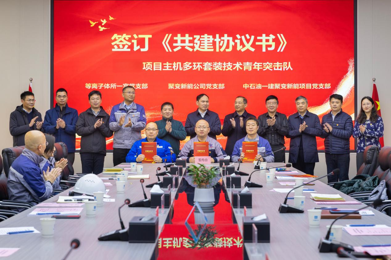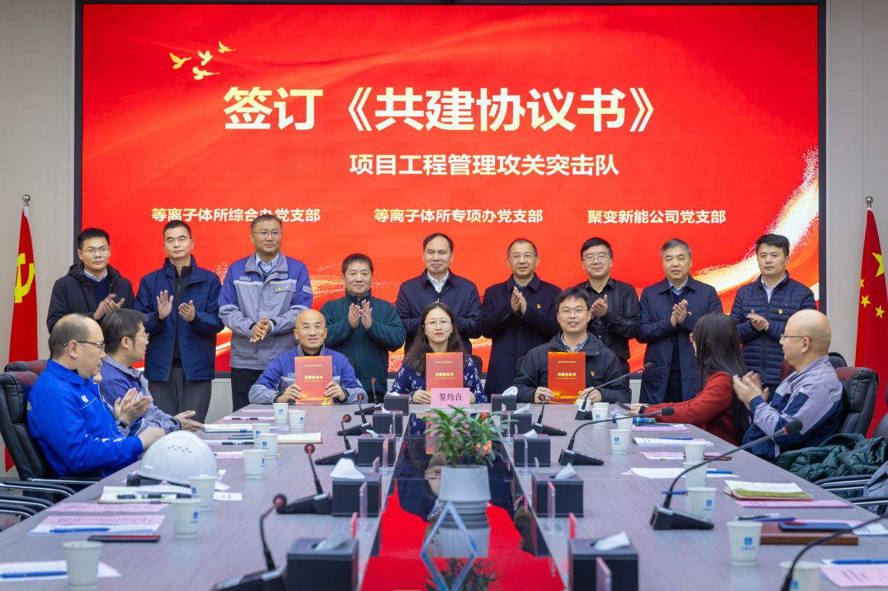 宋云涛在讲话指出,本次活动旨在深化两支突击队的党建业务融合,构建学习共建、问题共商、责任共担、现场共研的联动机制,汇聚管理智慧,突破执行瓶颈,为项目如期高质量完成提供坚强保障。随后,全体与会人员深入学习领会党的二十届四中全会精神。在与会领导的共同见证下,等离子体所综合办党支部、专项办党支部与聚变新能公司党支部,以及等离子体所一室党支部、聚变新能公司党支部、中石油一建聚变新能项目党支部分别签订了《共建协议》。