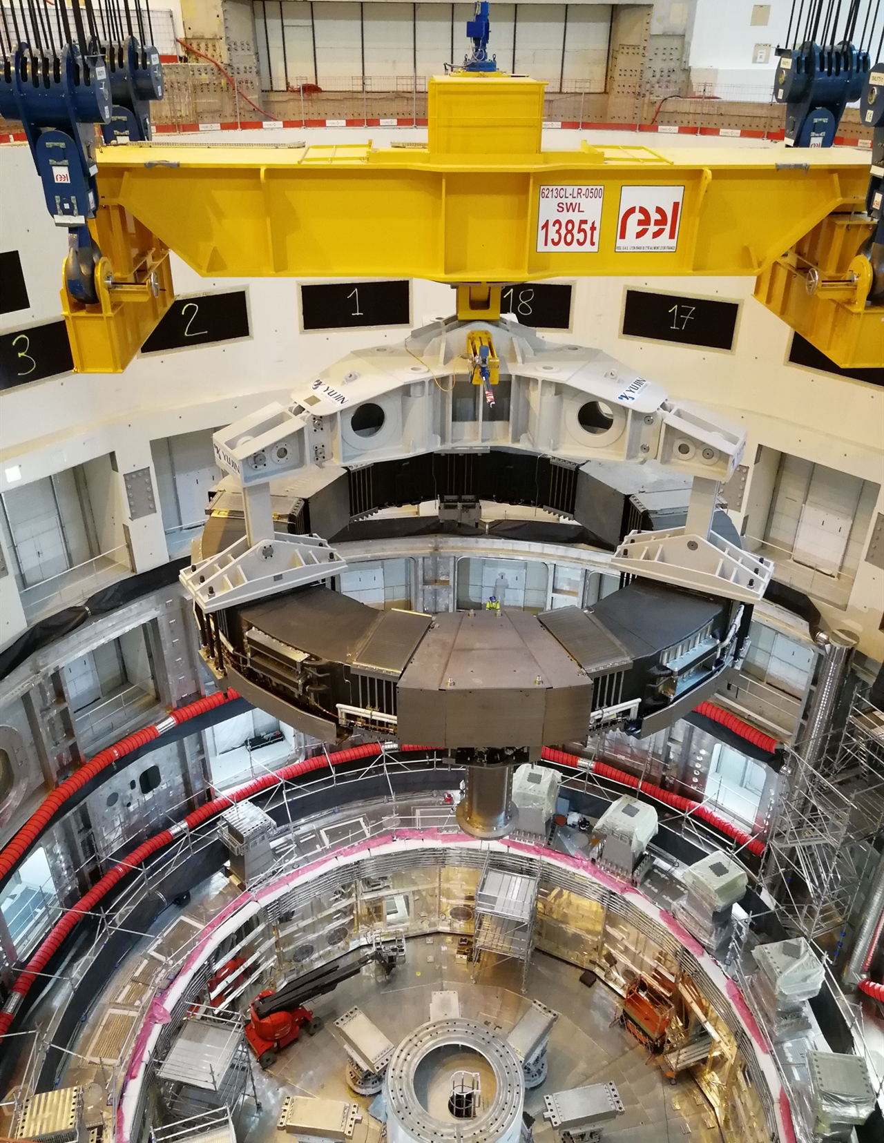 磁体系统是ITER实验堆的核心系统,各种类型的磁体共同编织出一个由磁场组成的容器,来约束1.5亿摄氏度的等离子体,从而保证聚变反应能够控制在特定的区域内并实现可控。ITER极向场线圈系统由6个不同尺寸的独立线圈组成,PF6线圈位于最底部。PF6线圈是等离子体所通过国际竞标承接的欧盟采购包制造任务,是目前国际上研制成功重量最大难度最高的超导磁体,线圈外径超过11米,截面高度约1.2米,重量400吨,起吊总重500吨。为保证PF6线圈能够安全准确地放置在临时支撑上,等离子体所ITER工程安装团队克服了主机部件多国供货、装配接口复杂等诸多困难,开展了多次沙盘推演,制定应急预案,模拟吊装演练。经过一整天的多工位各工种相互配合,PF6线圈最终成功落位,后续的超导馈线、PF5线圈、校正场线圈等工作将陆续展开。按照安装进程安排,PF6线圈安置于临时支撑上,在环向场线圈和真空室组装焊接完成后,PF6线圈将调整位置,最终安装固定。