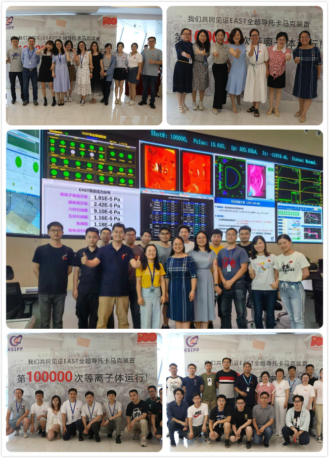 喜迎建党百年华诞,装置运行百秒亿度。在全党全国上下喜迎建党100周年之际,近日,正在开展的第16轮EAST装置物理实验再次创造托卡马克运行新的世界纪录,也迎来了其第100000次放电这一重要时间节点。6月8日下午,等离子体所大科学工程团队四代聚变人共聚装置控制大厅,共同见证EAST装置第100000次等离子体运行的重要时刻。