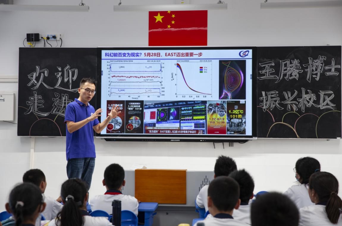 王腾等三位博士以轻松幽默的语言、灿烂绚丽的图片、活泼生动的互动体验,带领孩子们开启了本次科普之旅。“追逐太阳”专题科普讲座,从科幻作品中的梦想到现实研究中的突破,王腾博士站在中学生的视角,以科普的语言深入浅出地讲述了受控核聚变研究的基本科学知识和托卡马克装置最新研究进展,并通过巧妙的实验为大家形象地演示了磁约束等离子体的神奇现象,让抽象的概念变得生动形象。罗宇涵博士在“极地之眸”科普讲座中带领孩子们认识、发现、探索南北极,以3次参加南北极科考的亲身经历,为孩子们讲述了真实的南北极自然生态状况,分析了产生臭氧空洞、全球变暖的原因。梁驹华博士在“从原子角度谈航天材料”科普报告中从原子运动的视野出发,利用汽车碰撞、干将铸剑等经典案例,介绍了航天材料嫦娥钢的缓冲吸能原理及前世今生,吸引了同学们对原子、物质的认知以及航天科技的向往。