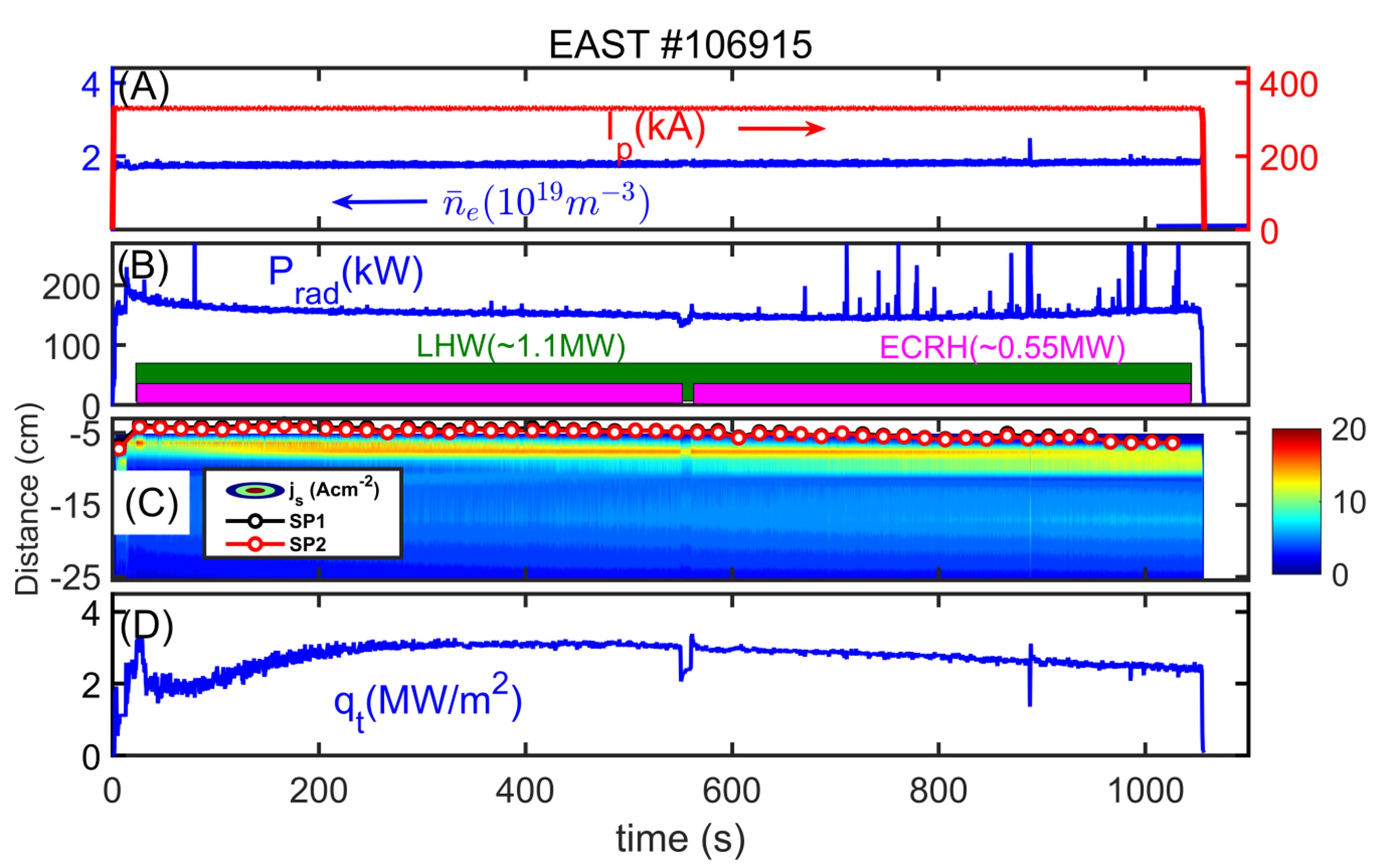离子饱和电流js以及靶板打击点SP1和SP2(C),偏滤器热通量峰值qt(D)
