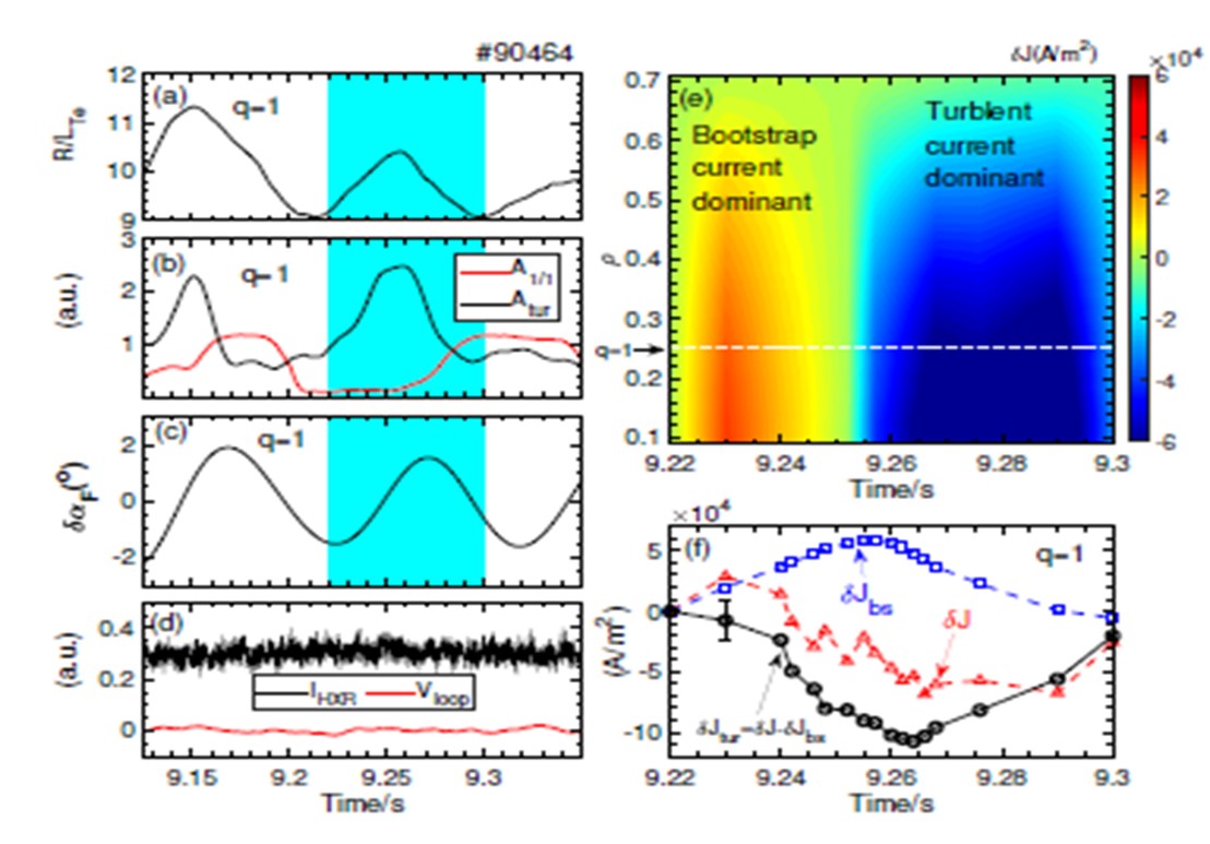 日前,核聚变大科学团队还首次证明了托卡马克等离子体中存在湍流驱动的电流成份,是保持高电子温度稳定运行的关键物理机制。借助湍流回旋动理学模拟计算证实了实验中观察到的湍流是电子温度梯度模,其产生的剩余协强可驱动这一电流。湍流驱动的电流和压强梯度共同驱动内扭曲模,形成湍流-湍动电流-内扭曲模自我调节系统,从而维持芯部电子温度梯度稳定。相关研究成果日前发表在《物理评论快报》(Physical Review Letters)上。(图3)