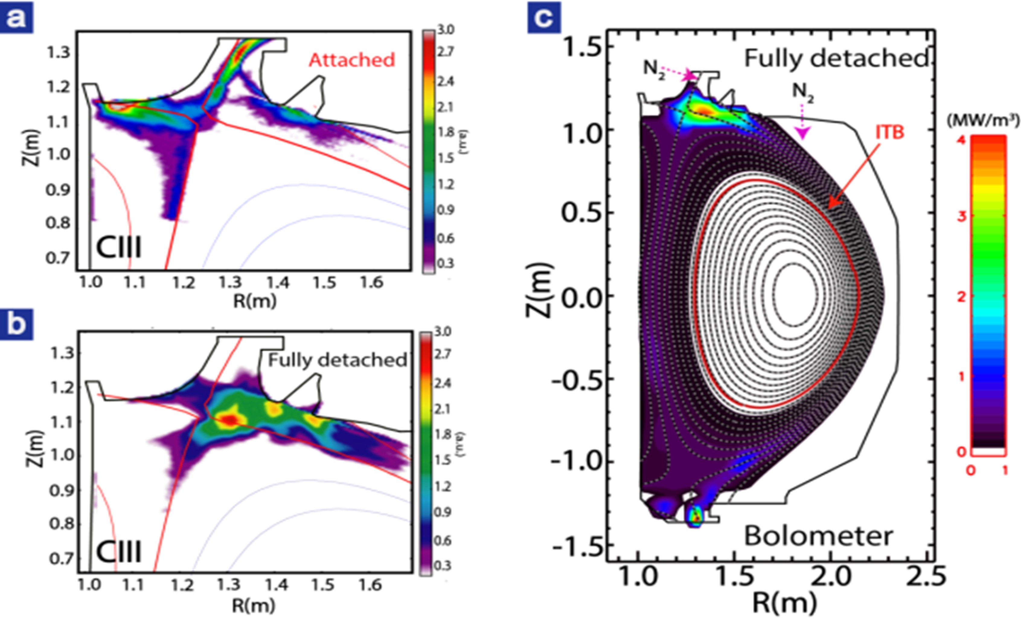 此外,核聚变大科学团队在托卡马克装置中外联合实验中利用封闭偏滤器下的杂质注入脱靶控制,以及高极向比压运行模式下双输运垒带来的约束增强,实现了高比压高参数芯部等离子体与偏滤器全脱靶状态的有效兼容集成。结合理论模拟揭示了偏滤器脱靶、边界输运垒和内部输运垒三者之间相互作用的物理机制。脱靶引起的双输运垒的自组织协同作用,改善了芯部与边界的兼容性,带来了能量约束的净增益。相关研究成果之前发表在《自然·通讯》(Nature Communications)上。(图4)