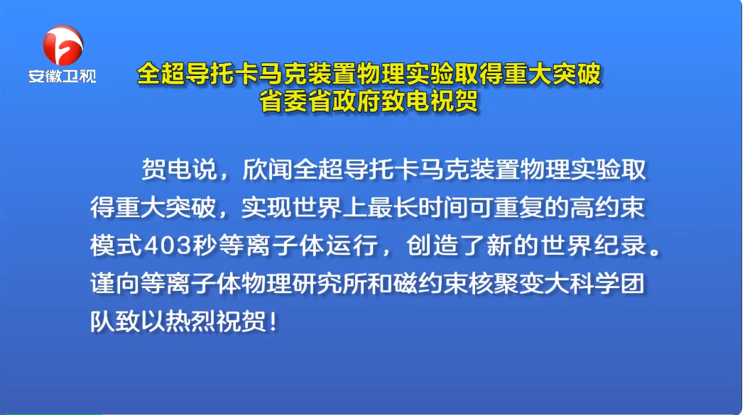 安徽省委省政府致电祝贺EAST物理实验取得重大突破