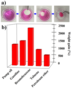 硅树脂改性后的钛酸盐纳米薄膜可以有效的进行油水分离(用罗丹明B标记的汽油)以及对其它有机溶液的去除研究