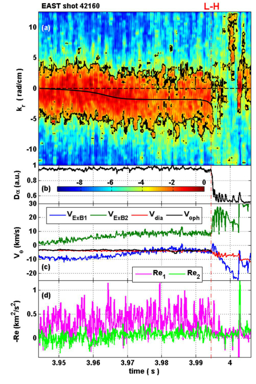 在EAST托卡马克实验中首次给出了L-H转换前湍流径向波数谱移动的直接实验证据。图中不同物理量的时间演化分别为:(a) 湍流径向波数谱,其中黑线表示平均径向波数<kr>的演化,(b) 偏滤器Dα信号,(c) 径向电场ExB漂移速度VExB、逆磁漂移速度Vdia以及静电涨落极向相速度Vθph,(d) 等离子体边界分界面内约5mm处的湍流雷诺协强Re1及近似分界面处的湍流雷诺协强Re2