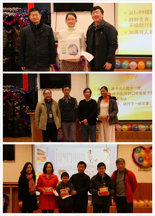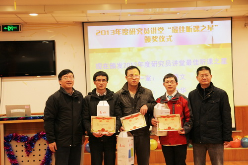 本次联欢会体现了文化与学术的结合,还举行了研究员讲堂颁奖仪式。2013年,我所正式启动研究员讲习制度并开设研究员讲堂,借此契机推动科教结合,搭建互动平台,在全所形成人人乐学的浓厚氛围,促进全员提升。去年共举办31场研究员讲堂专题报告会,据不完全统计,听课总人次近3000。联欢会上,傅鹏副所长和吴新潮副所长为“2013年度研究员讲堂最佳听课之星”张善文、吴金华、伍兴权颁奖。