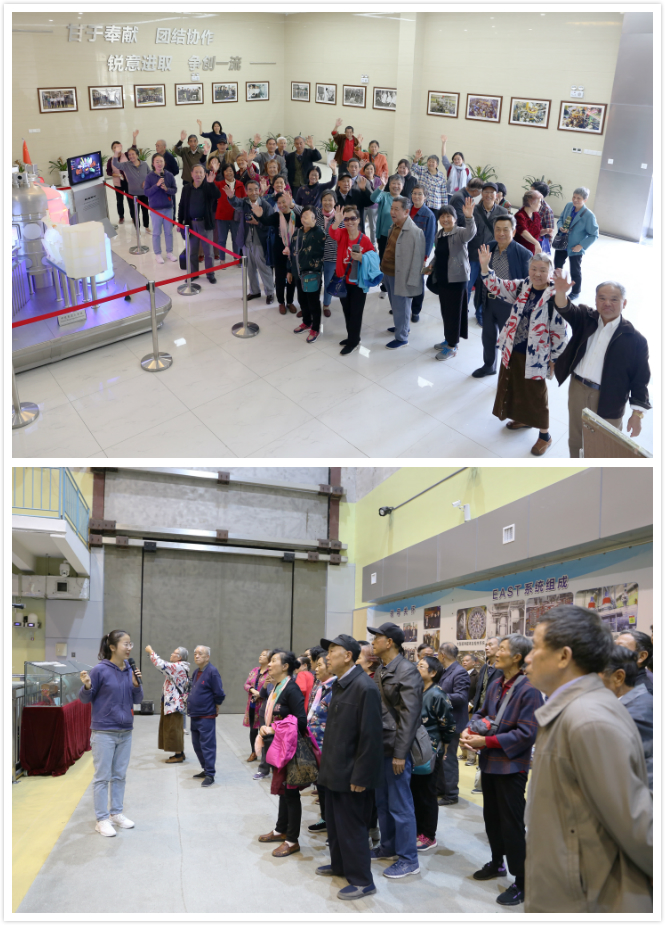 随后,老同志一行饶有兴趣地参观了EAST主机大厅、控制大厅。讲解员李雅琴为老同志详细介绍了EAST装置及控制大厅相关情况,老同志们在装置前合影留念。大家看到先进的实验装置和功能齐备的控制大厅,回忆起当年的科研条件,感慨科技的飞速发展和时代的巨大变迁。老同志们希望全所职工继续秉持艰苦奋斗、无私奉献的传统,为早日实现中国的聚变梦而努力拼搏。
