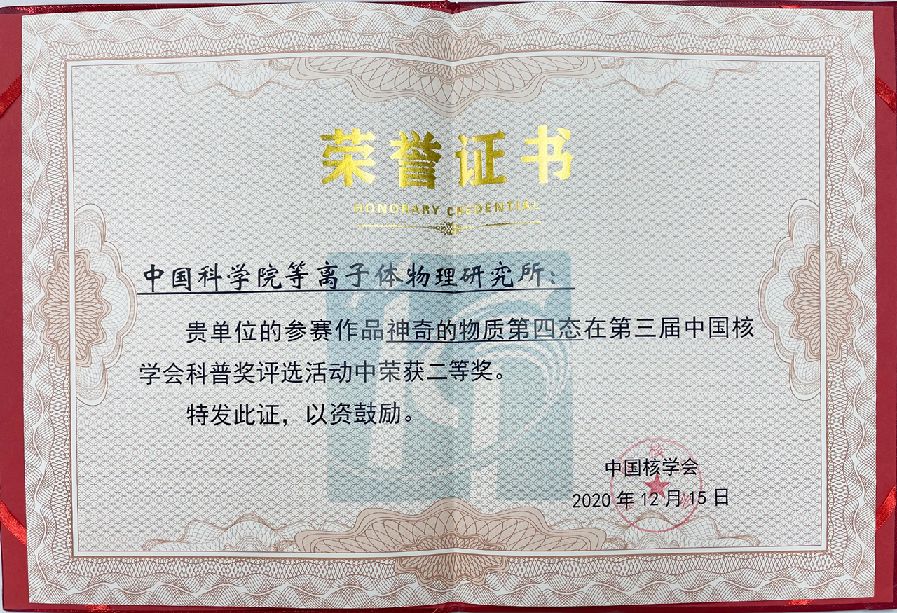 近日,第三届中国核学会科普奖评选结果揭晓,等离子体所科普作品《神奇的物质第四态》荣获核科普作品类二等奖,此外,等离子体所科普工作分管主任李家星被授予“先进工作者”荣誉称号。
