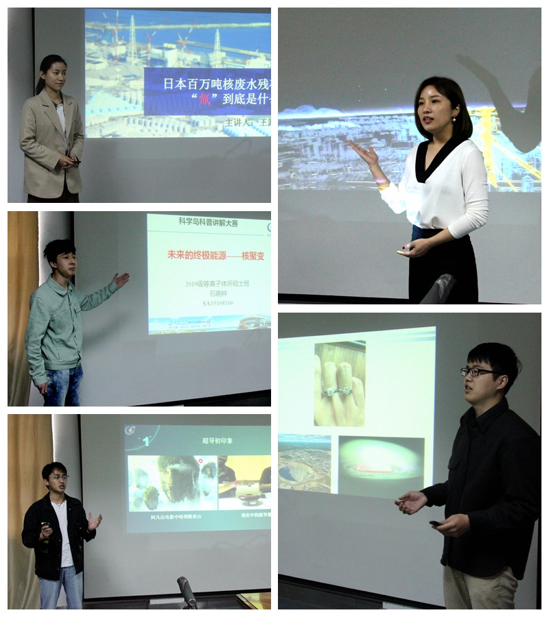 随后,来自全岛各研究所共计16名选手结合相关研究领域和科研成果,自选科普命题逐一进行现场讲解。等离子体所参赛选手王露以《日本百万吨核废水残存的“氚”到底是什么?》为题对氚元素进行了详细解说,她的精彩讲述打动全场,最终以第一名的好成绩摘获一等奖桂冠。石晓钟以第三代聚变传承人的身份对未来的终极能源——核聚变内容进行了充满正能量的阐释,最终以第三名的成绩获得二等奖奖项。许蕾、耿传文、朱鑫鑫等三名选手也表演不俗,分别获得三等奖、优秀奖等荣誉。