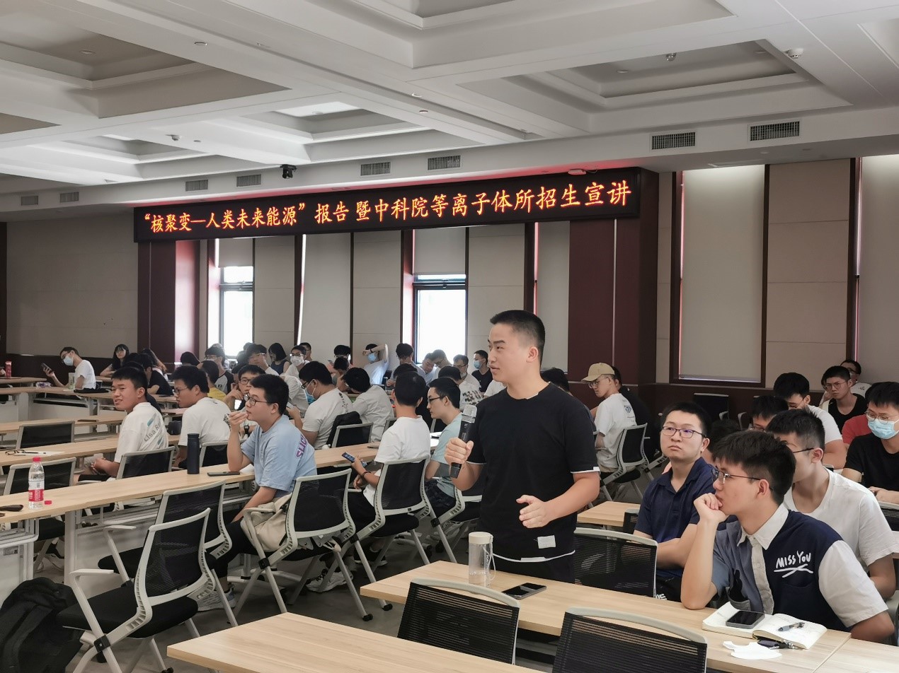 徐国盛首先进行了一场“核聚变——人类未来能源“的主题讲座,介绍了可控核聚变,特别是磁约束聚变的发展历史以及当今国际及国内相关领域的典型重大成就,同时他还重点介绍了中科院等离子体所的概况,强调了EAST装置物理实验和所承担的ITER采购包的国际影响力,阐述了等离子体所在CRAFT建设、CFETR预研以及技术转化领域的重大成果。通过聆听报告,学生们感受到了核聚变科学的魅力,展现了极大的兴趣。随后,徐玉平项目副研究员介绍了等离子体所相关招生政策及研究生教育方案,博士生卢迪安、李雪纯分别分享了自己报考等所的心路历程和所内学习、生活体验。在随后的交流环节中,同学们就专业问题、报考方式等方面提出了问题,徐国盛一一做出解答。