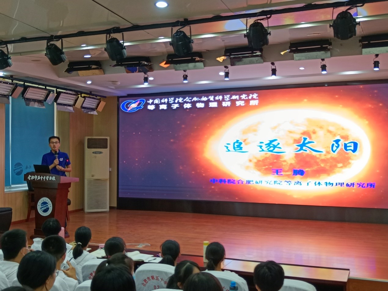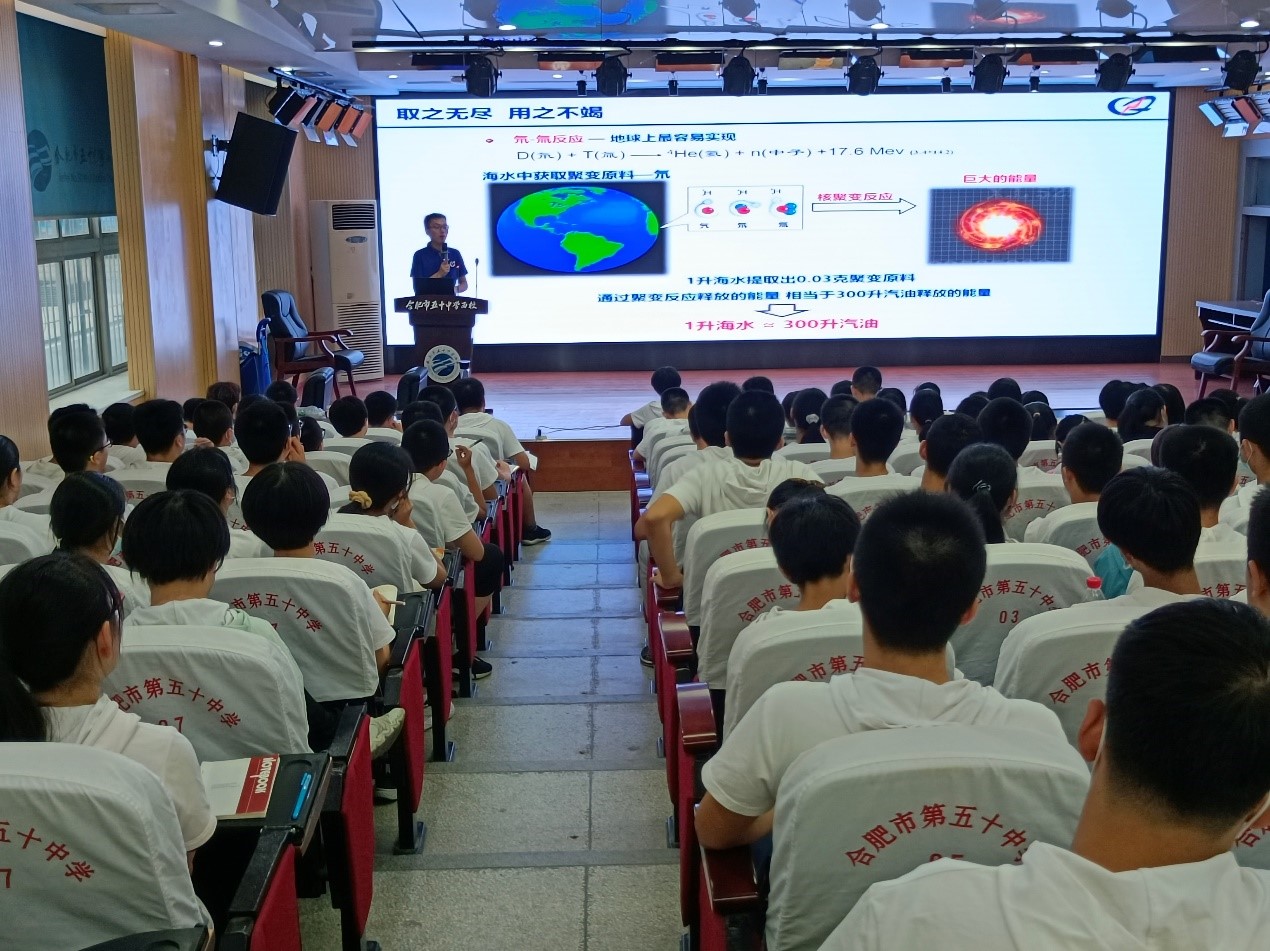 9月18日下午,阳光科学社王腾博士走进合肥市第五十中学西校,为一百多名九年级钱学森班的师生作以“追逐太阳”为题的专题科普讲座。从科幻作品中的梦想到现实研究中的突破,从核聚变的原理到人造太阳的建造,从等离子体的奥妙到磁约束聚变的实现,王腾博士站在中学生视角,以科普的语言深入浅出地向同学们讲述了受控核聚变研究的基本科学知识和最新研究进展,并通过巧妙的实验为大家形象地演示了磁约束等离子体的神奇现象,让抽象的概念变得生动形象,赢得掌声连连。