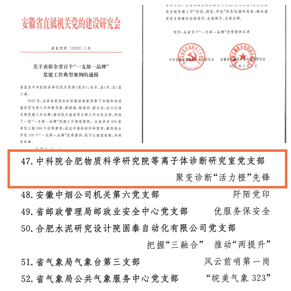日前,中共安徽省直属机关工作委员会、安徽省直属机关党的建设研究会联合表彰全省百个“一支部一品牌”党建工作典型案例,中科院合肥物质科学研究院等离子体所九室党支部“聚变诊断‘活力橙’先锋”案例荣膺其中。