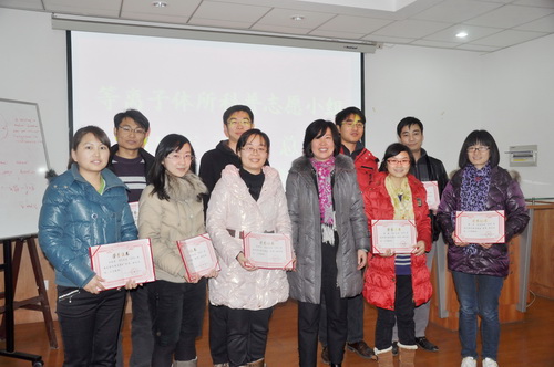 会议对吴靖、邱立龙、陈德鸿、袁洪文、朱梁、鄢容、汪桂霞、蒋敏、张素贞等九名做出突出贡献的志愿者进行了表彰,并授以“2011年优秀科普志愿者”荣誉称号,何友珍主任为获奖者颁发了证书。
