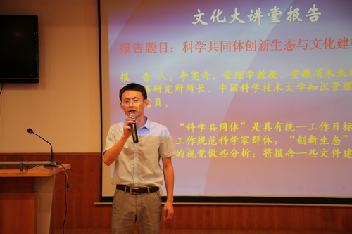 颁奖典礼当天,“ASIPP文化大讲堂”再次开讲。管理学教授李宪奇应邀作“科学共同体创新生态与文化建构”报告,他结合我所大科学文化,阐述了“科学共同体”和“创新生态”内涵,以具体案例,从文化上偏软的视觉做出分析,介绍了一些文化建构的内容,并就研究所创新文化建设提出了一些建议。