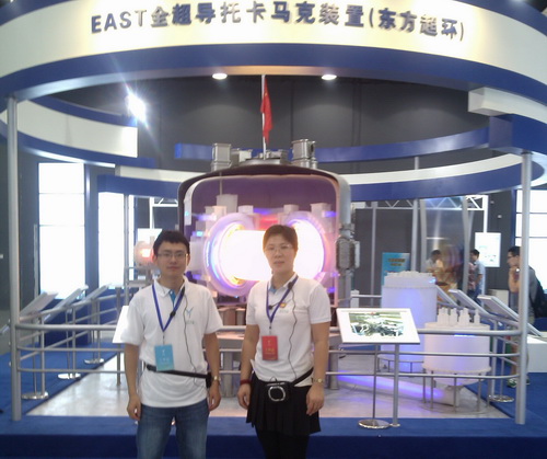 为更好地向公众传播核聚变相关科普知识,赵鹏、陆小飞两位科普志愿者为EAST模型助阵讲解。在为期一个星期的展会期间,两位讲解员共计接待公众数万人次,他们中有来自全国各地的科研单位领导,科普场馆负责人,也有关心科学发展的热心观众。讲解员以通俗易懂的语言向参观公众介绍EAST项目的意义和进展,使参观者了解核聚变研究是一个艰难的、需要几代人不懈努力才能实现的大科学工程。核聚变的终极研究目标是服务于民众和社会,核聚变的研究成果将满足人类对洁净能源的需求。通过讲解员深入浅出的介绍,参展公众纷纷赞叹我所在聚变领域取得的重大成果,同时送给我们更多的鼓励与祝福,希望早日实现聚变能的商业化,祝福我们的国家更加繁荣富强!