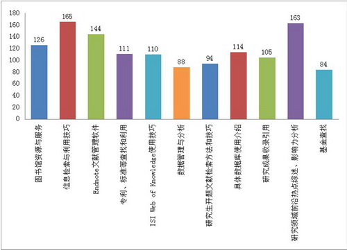 本次问卷调查设计的重点是读者对图书馆信息培训的需求情况。调查结果归类分析如图所示。图表可见,11项培训主题中,各项都占有不小的比例,说明读者对这些培训项目都有一定的需求,突出举办培训讲座的重要性。需求占比最高的是“信息检索与利用技巧”,其次是“研究领域前沿热点影响力分析”和“Endnote文献管理软件”。这将作为所图书馆10月份读者活动周确定培训内容的直接依据。